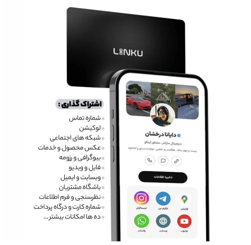 این کارت ویزیت هوشمند مبتنی بر فناوری NFC است که به شما امکان میدهد اطلاعات تماس و دیگر محتوای مرتبط با کسب و کار خود را به راحتی در اختیار مشتریان قرار دهید. با لمس ساده کارت توسط گوشی هوشمند مشتری، تمام اطلاعات مورد نیاز به راحتی در دسترس قرار میگیرد.